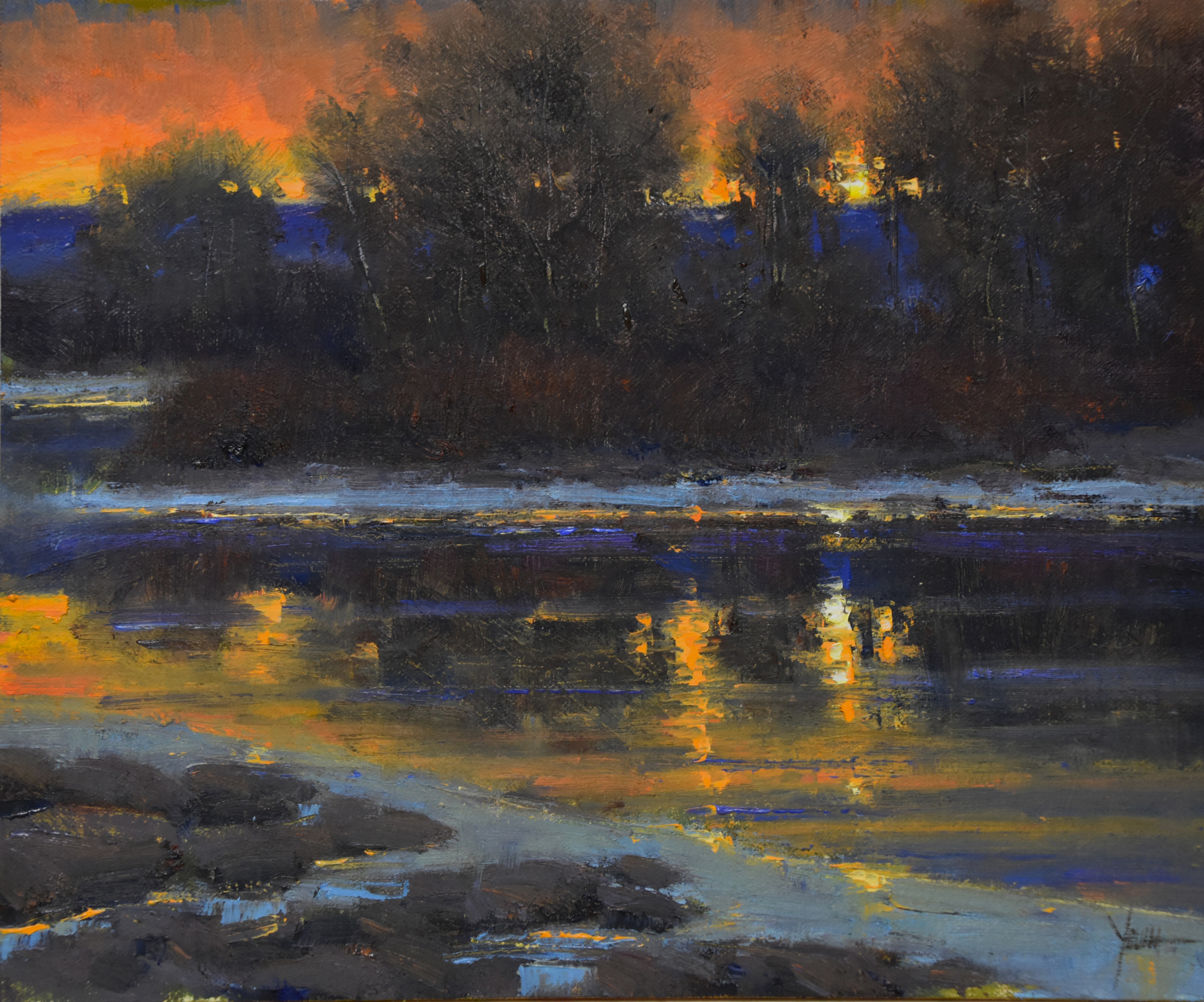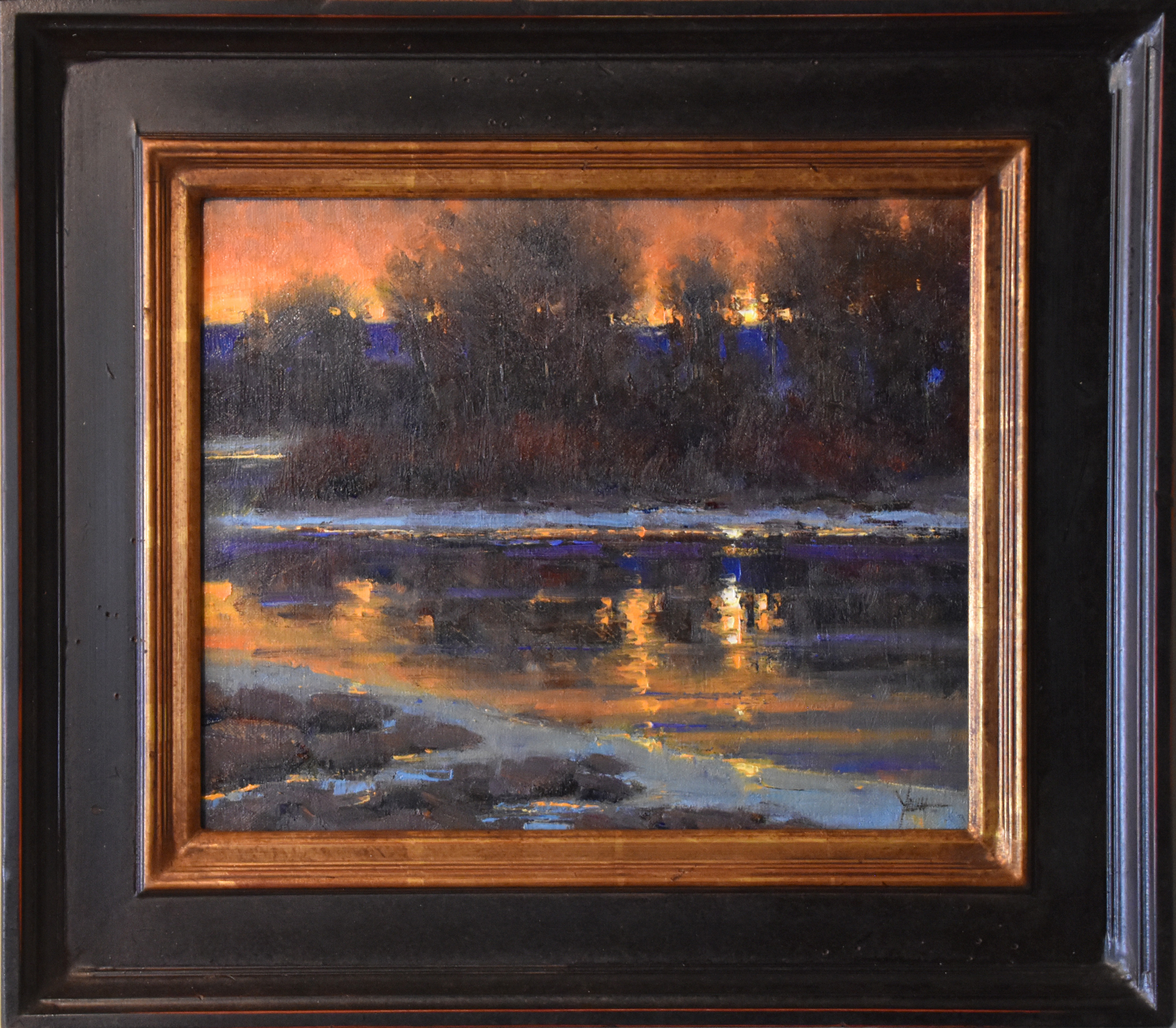 “This painting is a side channel of the Colorado River near my studio. I have seen many a sunrise in this location. Wintertime is a favorite time of year to explore this area. The channel changes daily as it freezes and thaws with the fluctuating temperatures. There are new painting design ideas everyday.” Dan Young
