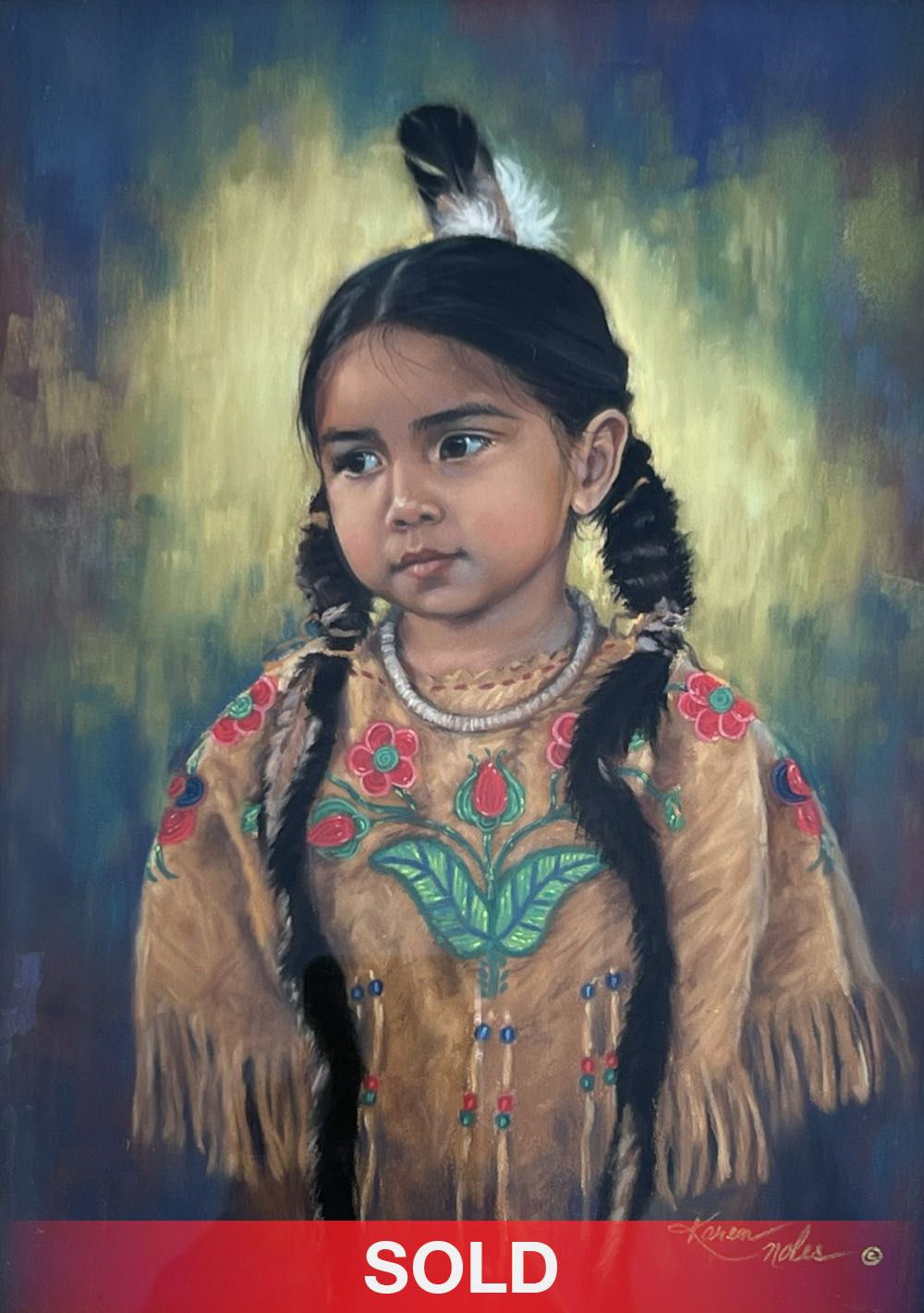 Noles begins her paintings by photographing her subjects on location, then developing drawings on canvas using an umber wash. Her work is highly detailed, with a focus on achieving a luminous, translucent quality that brings her subjects’ emotions and personalities to life. She has a particular interest in traditional Native attire and spends countless hours carefully rendering beadwork, clothing, and adornments, honoring both the individual and their cultural heritage.