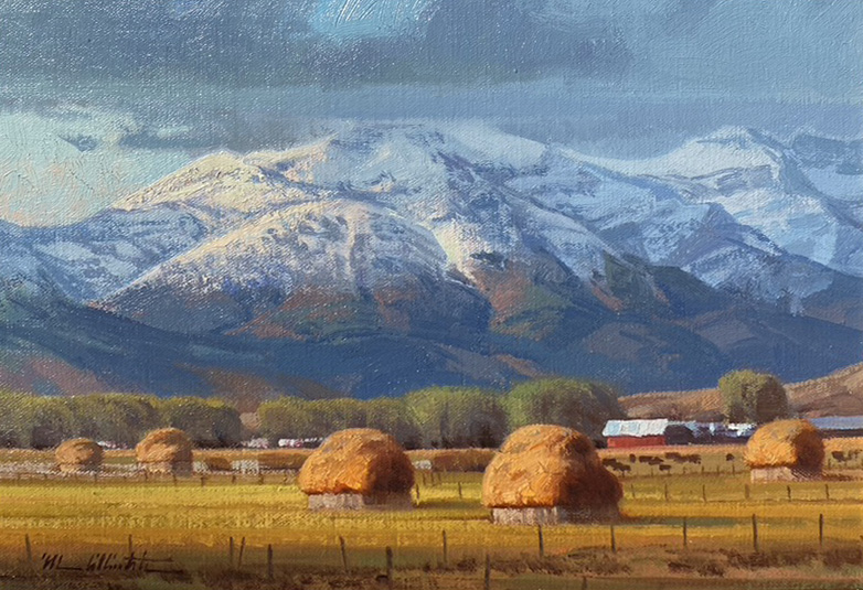 Michael Albrechtsen Timing snow landscape hay bales western oil painting